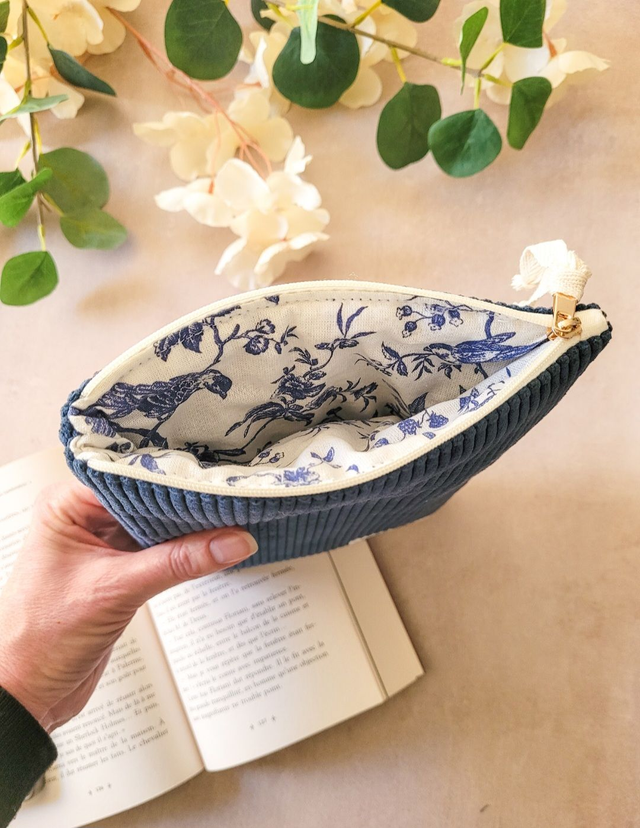 Mila est une pochette molletonnée zippée, confectionnée dans un velours côtelé avec un intérieur en coton imprimé.