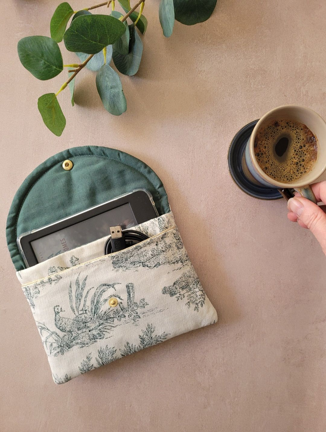 Offrez à votre liseuse la protection qu’elle mérite avec cette jolie pochette molletonnée en toile de Jouy verte.